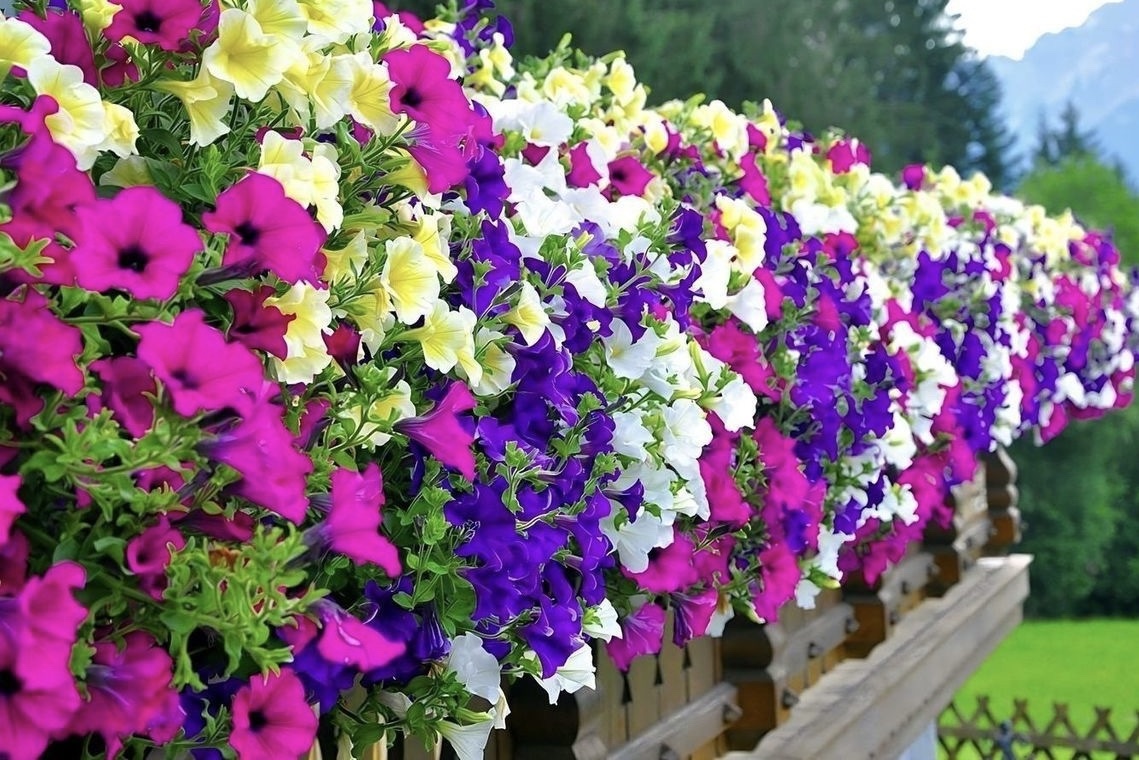 Любимая многими Петуния – несомненный фаворит среди красиво цветущих садовых однолетних растений. Обильное цветение этой красавицы длится с конца весны и до осени. Растения удивительно неприхотливы и отличаются лёгкостью в выращивании и уходе. Петуния прекрасно подходит для оформления клумб, вазонов, балконных контейнеров и подвесных кашпо. Великолепно сочетается с другими декоративными растениями, позволяя создавать очень красивые композиции. Стебли по всей длине усыпаны цветами и бутонами. Размер и окраска цветков зависит от сорта петунии. Взрослые растения выглядят как пышный, цветочный водопад.