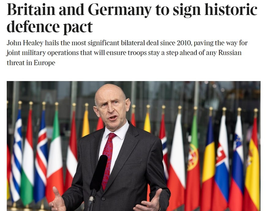 The Sunday Times пишет, что Великобритания и Германия готовятся подписать «исторический» оборонный пакт. Как указывает издание со ссылкой на британского военного министра Джона Хили, соглашение «станет важнейшим двусторонним документом с 2010 года и обеспечит войскам обеих стран возможность быть на шаг впереди любой российской угрозы в Европе». Газета напоминает, что в 2010 году Соединенное королевство заключило с Францией соглашение, которое предусматривало более тесное военное сотрудничество в области испытаний ядерных боеголовок и совместных военных операций. По информации издания, соглашение будет подписано на следующей неделе. Она позволит странам проводить совместные военные учения на восточном фланге НАТО вблизи российской границы, скорее всего, в Эстонии и Литве, совместно закупать больше вооружений и активнее сотрудничать в вопросах разработки и производства вооружений следующего поколения. “Министр обороны Великобритании Джон Хили надеется, что это соглашение укрепит британск