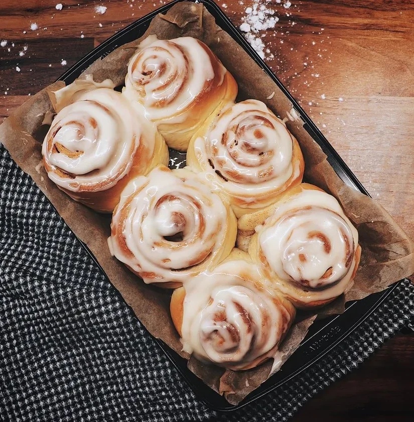Предлагаю вам приготовить эти роскошные булочки. Ингредиенты для теста: • Молоко — 250 мл • Сливочное масло — 60 г • Яйцо — 1 шт. • Мука — 450-500 г • Быстродействующие сухие дрожжи — 2 ч.л. • Сахар — 3 ст.л. • Ванильный сахар — 1 пакетик • Соль — щепотка Ингредиенты для начинки: • Коричневый сахар — 200 г • Молотая корица — 1 ст.л. • Сливочное масло — 50 г (размягченное) Ингредиенты для глазури: • Творожный сливочный сыр (например, Almette или Hochland) — 150 г • Сахарная пудра — 150 г • Лимонный сок — 2 ст.л. • Молоко — 1 ст.л. Приготовление: 1. В глубокой миске смешайте муку, дрожжи, соль, сахар и ванильный сахар. 2. Влейте теплое молоко и растопленное сливочное масло, добавьте яйцо. Замесите тесто. 3. Уберите тесто в теплое место на час, чтобы оно увеличилось в объеме вдвое. Для начинки: 4. В отдельной миске соедините коричневый сахар и корицу. Добавьте размягченное масло и перемешайте до получения консистенции «мокрого песка». Сборка булочек: 5. Раскатайте тесто в прямо