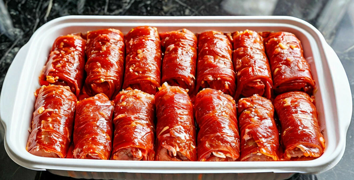 - Сворачиваем в рулетики и выкладываем в форму, предварительно смазываем маслом.