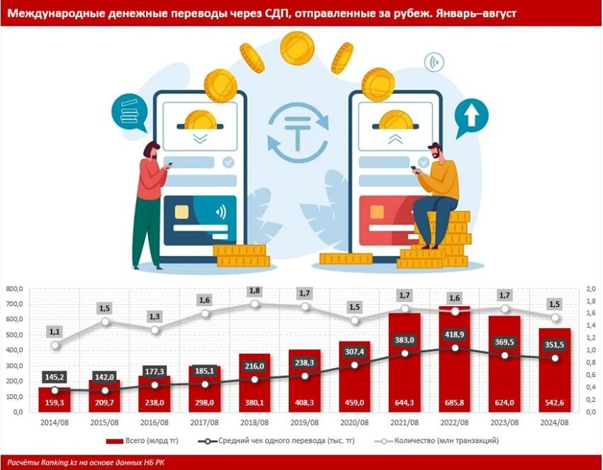 За январь–август текущего года через международные системы денежных переводов (СДП) из Казахстана за рубеж было отправлено 542,6 млрд тг — на 13,1% меньше, чем за аналогичный период 2023-го. Годом ранее также наблюдалось уменьшение объёма — на 9%, сообщает ranking.kz Количество транзакций сократилось на 8,6%, до 1,5 млн, что уменьшило средний чек одного перевода с 369,5 тыс. тг за январь–август 2023-го до 351,5 тыс. тг за январь–август 2024 года. Объём полученных из-за рубежа через СДП денежных переводов за январь–август 2024 года, в свою очередь, составил 162 млрд тг — сразу на 23,1% меньше, чем за аналогичный период прошлого года. Годом ранее объём полученных переводов также показывал резкий спад — почти в 2 раза. Сократилось и количество транзакций: на 26,9%, до 557,1 тыс. Средний чек одного перевода при этом увеличился на 5,2%: с 276,2 тыс. до 290,7 тыс. тг. Наибольший объём отправленных за рубеж через СДП денежных переводов пришёлся на Узбекистан и Россию: 167,2 млрд и 158,4 млрд
