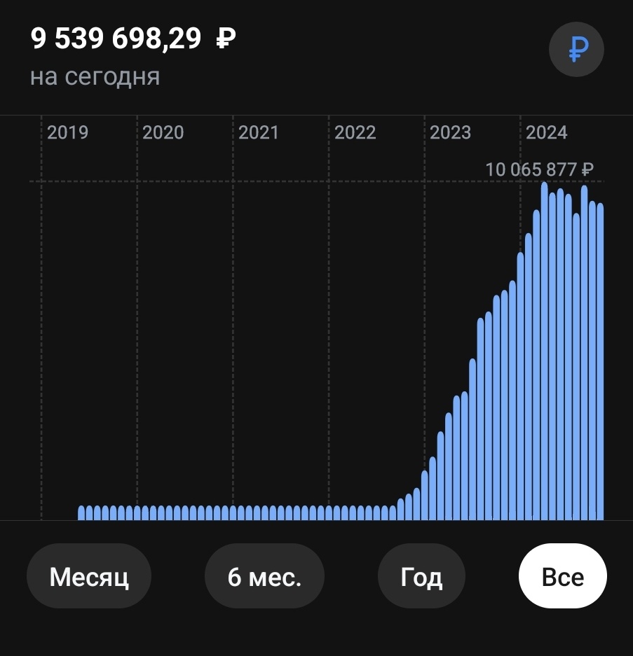 Всех приветствую, Сентябрь был закрыт чуть ниже 10 млн - 9,991 рублей. Год назад в октябре 2023го портфель был 7,25 млн рублей. А вот конец октября после заседания ЦБ очень не порадовал. Портфель закрылся на отметке - 9,539 млн рублей Портфель стал настолько большой относительно ежемесячных пополнений что сглаживать колебания до внесениями не получается. Ну и в очередной раз не удалось закрыться выше 10. Сбер был докуплен до 5000 штук, хотя потом цены были еще приятнее, ну да ладно я же его не на один месяц беру и даже не на один год. Первые покупки были в 2019м году. Лукойл покупок не было с сентября сейчас 160 бумаг и жду утверждения дивидендов. Норникель (тут половина облигации) были докупки суммарно по нему -35% Но оптимизма добавляет "воскресший Полюс" долгое время он был у меня в минусе, а сейчас +50% и еще дивиденды Роснефть активно докупаю сейчас 1100 акций цель довести примерно до 0,75 от Лукойла это примерно 1500 акций Золото активно росло не смотря на то что часть была про