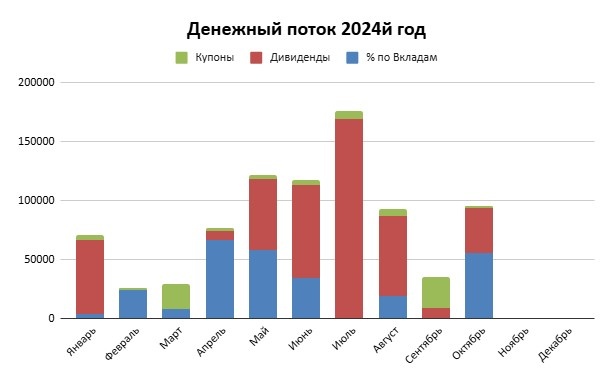 Всех приветствую, После сентябрьских 35 тысяч рублей октябрь порадовал ростом дохода: Октябрь обошел неплохой август и денежный поток от моих инвестиций составил - 95.348 рублей Напомню как я все это считаю: Дивиденды, купоны по основному портфелю (ИИС и Домик у Моря сюда не входят). Так же сюда относятся проценты (после закрытия вклада) по тем вкладам что я для себя считаю в капитале, а не подушке безопасности. Дивиденды и купоны считаются уже "чистыми" после вычета НДФЛ. Дивиденды: 38008 рублей, довольно результативный месяц, заплатили: Газпромнефть, ФосАгро, Татнефть, ММК, НОВАТЭК. В целом весьма не плохо с учетом что и компании не самые дивидендные, да и доли в портфеле по ним небольшие. Купоны по облигациям: 1700 рублей, тут скромно так как в основном портфеле почти нет облигаций. Но я решил с ноября внести изменения и учитывать в этой статье и купоны из портфеля под ипотеку, так как ипотечный платеж я ставлю в расходы то и доход от портфеля который должен частично его перекрыват
