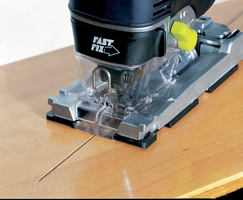 Нулевой зазор достигается за счёт закрепления накладной пластины на опорной подошве инструмента. Накладка имеет всего одно узкое отверстие (или прорезь), плотно прилегающее к режущему органу. Из-за этого даже при большом усилии подачи зубья гарантированно будут срезать мелкую стружку, а не выворачивать щепу в верхнем слое детали.