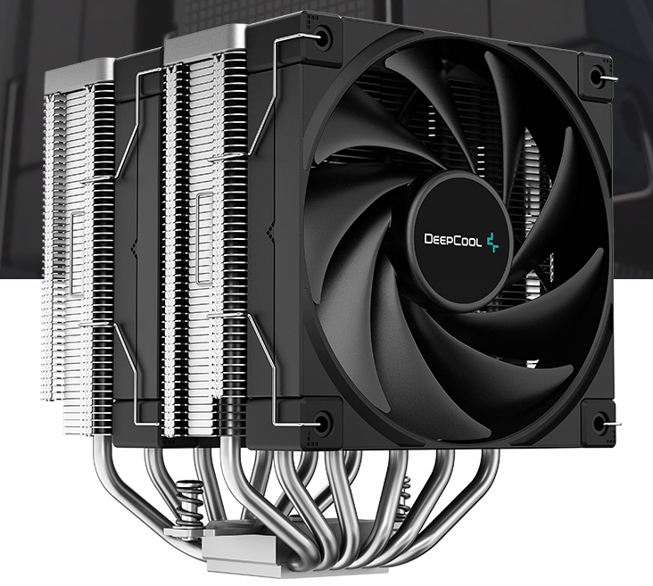 Двухбашенный радиатор на шести тепловых трубках, два вентилятора, универсальное крепление и невысокая для систем охлаждения такого класса стоимость. Осталось только убедиться, что он действительно эффективен и нешумный. Это не просто кулер, а суперкулер, поскольку заявленный уровень тепловыделения, с которым он должен справиться, составляет 260 ватт. Это довольно высокое значение для воздушных систем охлаждения. Однако AK620 отличается сравнительно скромными размерами, к тому же он оснащён двумя 120-мм вентиляторами. Особенности конструкции Deepcool AK620 – классический башенный кулер с двухсекционным радиатором и двумя вентиляторами. Кулер старается выглядеть максимально прямоугольно – все грани его компонентов выверены и строго соответствуют друг другу. Секции радиаторов с прямоугольными пластиковыми накладками под углеволокно, вентиляторы строго квадратные, с акцентированными вставками по углам. Система охлаждения производит впечатление крепко сбитого устройства без зазоров и резки