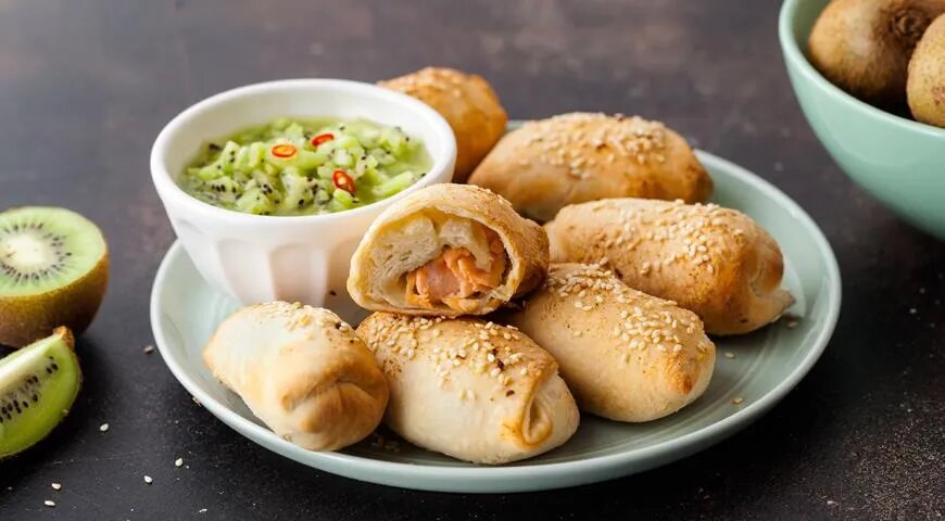 Если вы иногда посещаете рестораны, возможно, заметили, что всё чаще люди предпочитают заказывать рыбу вместо мяса на ужин. Учтите это при составлении меню для праздничного застолья или семейного ужина. Рыбные блюда выглядят эффектно, имеют приятный вкус и при этом достаточно легкие. Обжарьте филе лосося на сухой сковороде с антипригарным покрытием на среднем огне по 1–1,5 минуты с каждой стороны. Переложите его на разделочную доску, дайте остыть, затем натрите васаби. Нарежьте филе на кусочки, размером с указательный палец. Раскатайте тесто на поверхности, присыпанной мукой, как можно тоньше. Разрежьте его на прямоугольники, достаточные для заворачивания кусочков лосося. Положите по кусочку рыбы на каждый прямоугольник теста и заверните их в виде конверта. Выложите на противень, смажьте маслом, посыпьте кунжутом и выпекайте в разогретой до 200 °C духовке 10 минут. Для соуса натрите имбирь на мелкой терке. Очистите киви и мелко нарежьте мякоть. Смешайте киви с имбирем, медом, чили и со