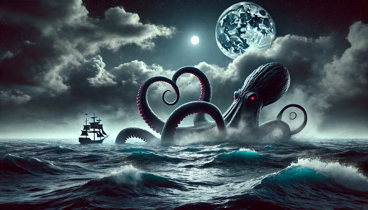 Представьте себе: глубокая ночь, морская гладь, простирающаяся до горизонта, и абсолютная тишина... Только звук лёгкого плеска волн, шорох ветра, словно шёпот на грани слышимости. И вдруг — что-то глухое и неясное движется в глубине. Лёгкое колыхание воды, будто гигантский зверь переворачивается во сне... Огромная тень, что-то, чему нет конца и края. Что это? Мифический Кракен, поднимающий свои гигантские щупальца, или реальный гигантский кальмар, скрывающийся в тёмных водах океана?