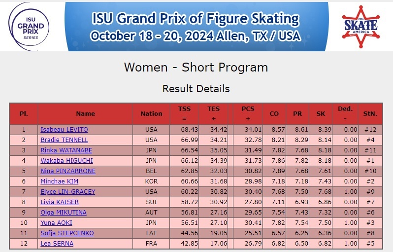 Вакаба Хигучи тоже иногда заходит на тренировках на тройной аксель. Главное для нее сейчас - выступать стабильно. Платье в виде перетяжек из темно-зеленого и пепельного цветов с блестками. Заходы на прыжки - длинные-предлинные. Смотрится мощно, чему и музыка способствует. Оценка- 66.12 балла и она четвертая с хорошими шансами на призы. Для Ринки Ватанабе из Японии важно было занять сточку в протоколе повыше, чтобы у нее сохранилась возможность для попадания в финал серии Гран-при. Тройной аксель чаще ей только мешает (недавно на Lombardia Trophy она пролетела с ним мимо призов), хотя в заявке он у нее есть. Двойной аксель, тройной лутц , каскад из тройного риттбергера и тройного тулупа. "Лунная соната" в ее исполнении, с менее ценным каскадом, принесла ей 66.54 балла и это третье промежуточное место. Американка Бреди Теннел всерьез намерена побороться за призы в этом сезоне. Вот чего не скажешь о ее прокатах. Во-первых, она далека от своих прежних кондиций и явно к ним уже не вер