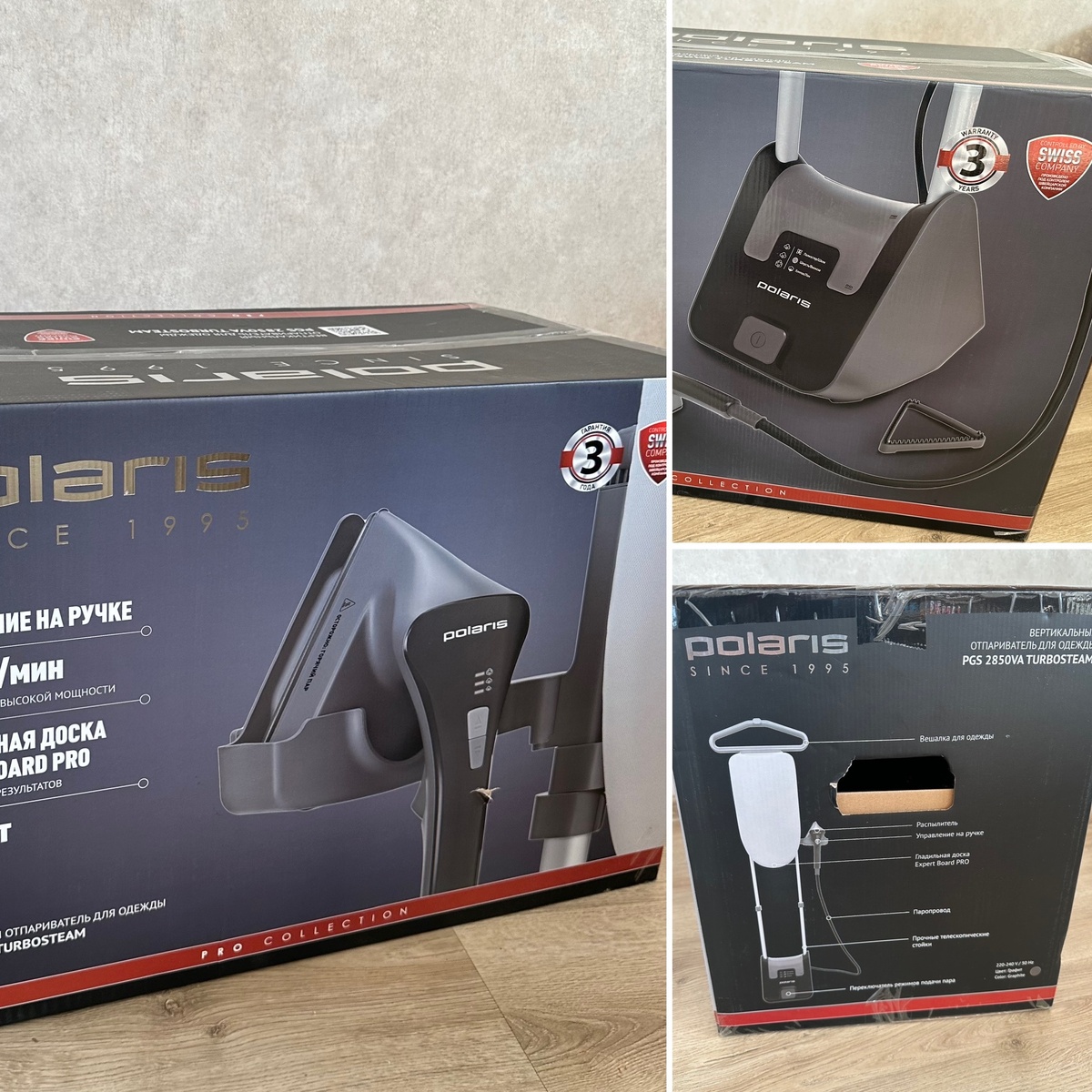 Здравствуйте! Сегодня хочу поделиться с вами отзывом на вертикальный отпариватель PGS 2850VA от Бренда Polaris. С данным брендом я знакома достаточно давно, и зарекомендовал в нашем доме он себя отлично. Вся техника от Polaris исправно служит верой и правдой. Поэтому когда встал вопрос о покупке вертикально отпаривателя, сомнений в выборе производителя не было. Данная модель представлена в единственном графитовом цвете, и приобрести её можно на официальном сайте производителя, маркетплейсах и онлайн магазинах, продающих бытовую технику. Цена товара варьируется от 17 до 19 тысяч рублей. Отпариватель упакован в объемную картонную коробку с красивым и стильным дизайном в темных тонах. На разных сторонах коробки указана подробная информация о товаре: общая информация, основные технические характеристики и плюсы данной модели. Для транспортировки домой рекомендую взять с собой мужа, так как коробка не только объемная, но и тяжелая. Все комплектующие вертикального отпаривателя были допо