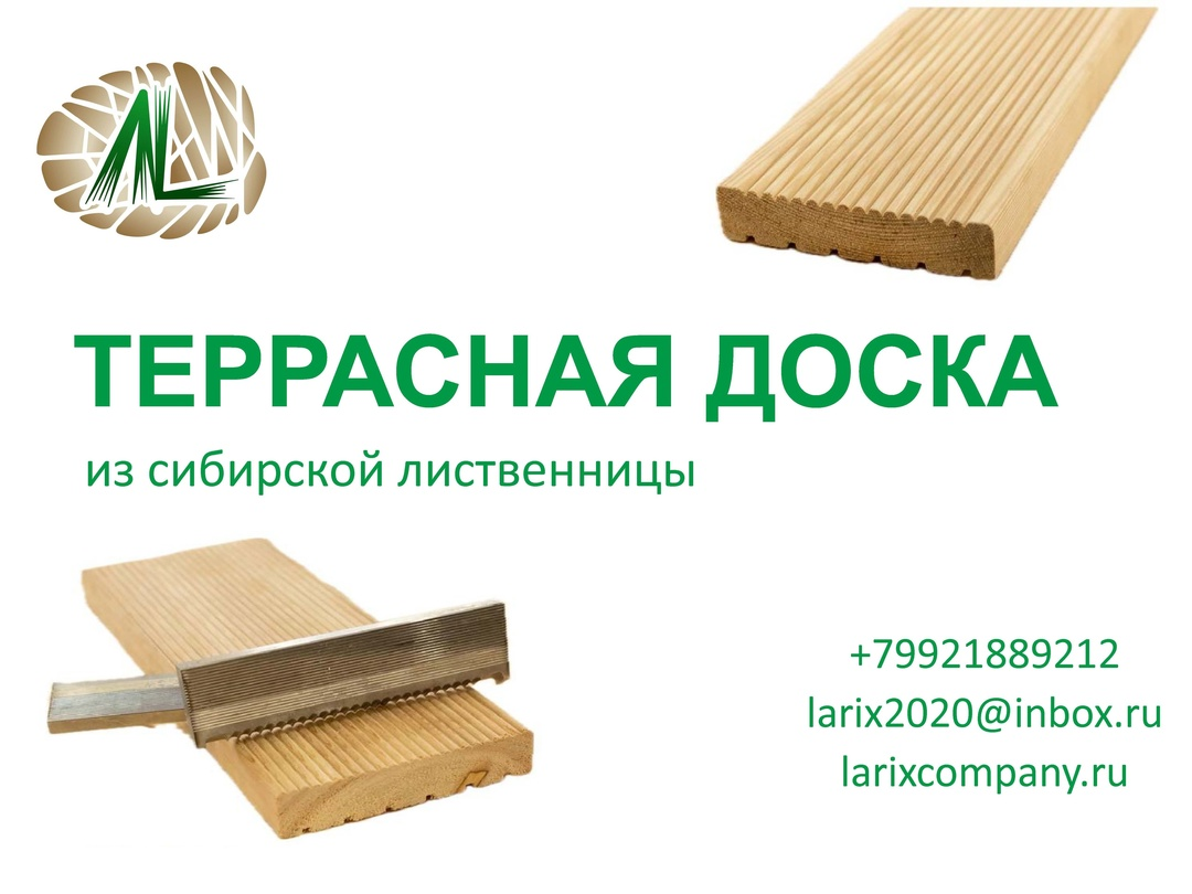 На календаре август, дачный сезон еще не закончен, а значит есть еще время для обустройства открытых пространств на ваших участках! Отличным решением может стать террасная доска из лиственницы, ведь от влаги доски из этой древесной породы становятся только крепче и не гниют со временем, надежно защищены от насекомых. Все это обусловлено высоким содержанием природной смолы. Террасная доска применяется в строительстве террас и веранд в загородных домах. Из нее делают дорожки в скверах и парках, а также настил для уличных площадок. Важным преимуществом является возможность размещения террасных досок у воды. Особенности террасной доски из лиственницы: Террасная доска часто используется в качестве настила при облагораживании территорий около водоемов и бассейнов. Закажите сейчас и получите качественный материал для вашей веранды или террасы, который прослужит вам долгие годы! тел. +7(992)188-92-12 написать в what's up, эл. почта Весь ассортимент пиломатериалов и изделий из лиственницы пред