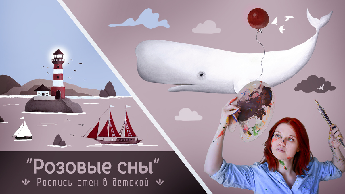 Какого цвета твои сны?! Такой вопрос я задала девочке, для которой планировала расписать стену в детской. "Розовые" услышала я в ответ. Меня зовут Евгения, и я хочу рассказать об этом проекте поподробнее. В центре композиции — кит-гигант, парящий на воздушном шаре. Рядом с ним, чуть выше, второй кит, меньшего размера. Шары такие легкие и крошечные по сравнению с величественными морскими гигантами, что кажется, как это возможно?! В этом есть смысл, эти два кита на воздушных шарах, как бы говорят, что самые смелые, нелепые мысли могут реализоваться, в данном случае взлететь, надо только позволить себе мечтать! Работая над этой композицией, я продумывала не только сюжетную линию, но и мелкие детали. Например, облака на заднем плане напоминают очертания животных, а именно зайца и ежика. Я помню из своего детства, как мы с подружками играли в игру "что ты видишь в облаках". Каждый раз эта игра превращалась в необыкновенные истории. А вы играли в похожую игру? Самое важное в работе — отличит