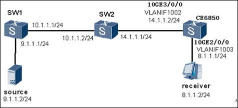 [HUAWEI-ospf-1-area-0.0.0.0] network 14.1.1.0 0.0.0.255 2. Включаем multicast на SW1, SW2, и CE6850. Настраиваем multicast на VLANIF интерфейсах. # Включаем Layer 3 multicast глобально на SW1 и SW2, далее включаем PIM-SM на двух VLANIF интерфейсах. # Конфигурация на CE6850: [HUAWEI] multicast routing-enable