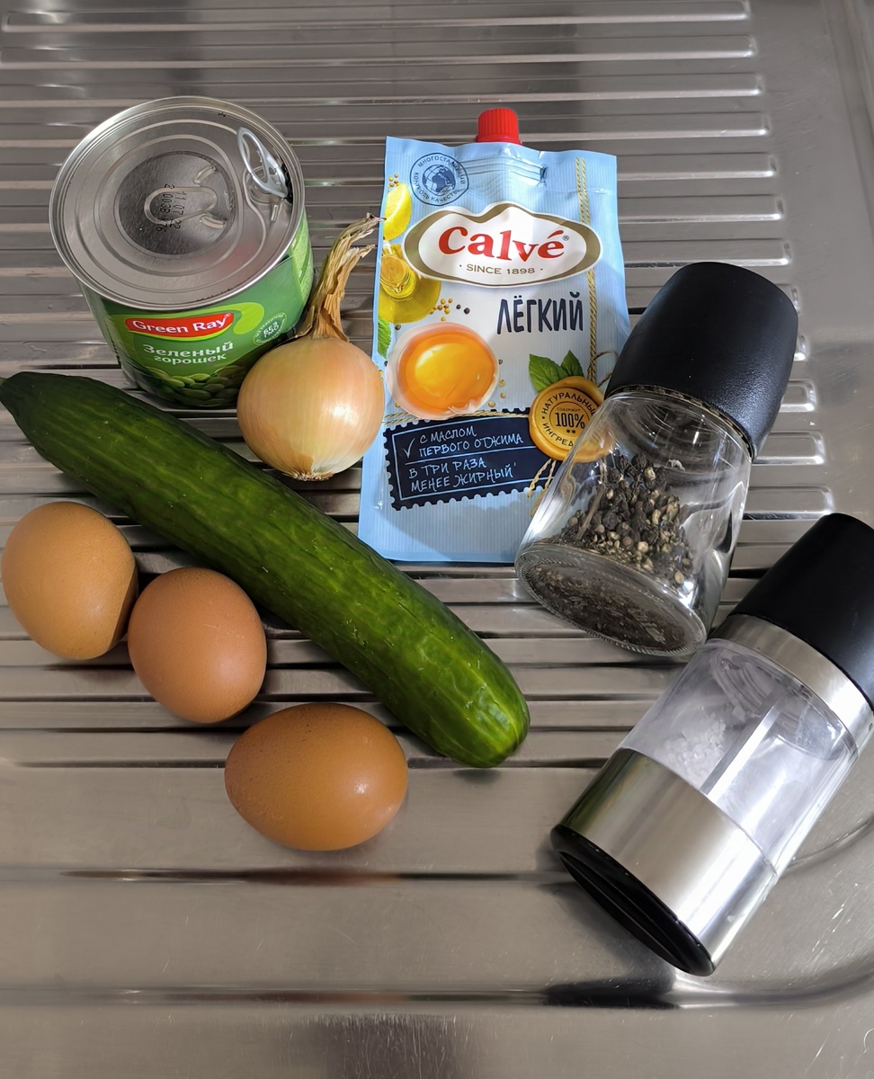 Такой салатик готовится за считанные минуты. Его можно подать как самостоятельное блюдо, а можно в качестве гарнира, например, к мясным котлетам. Ингредиенты самые простые и доступные в любой сезон. Да и с заправкой можно экспериментировать: майонез, сметана, йогурт или даже обычное рафинированное подсолнечное масло. Ингредиенты: - огурец большой 1 штука - яйцо куриное 3 штуки - консервированный зеленый горошек 1 банка ( 400 грамм) - соль, черный молотый перец, репчатый лук и майонез по вкусу Банку горошка открыть и слить всю жидкость. Яйца сварить в крутую, охладить, очистить и нарезать мелким кубиком. Огурец вымыть и нарезать мелкой соломкой. Лук очистить и нарезать мелким кубиком. В миске соединить яйца, лук, огурцы и консервированный горошек. Тщательно перемешать. Добавить майонез и специи. Снова перемешать.