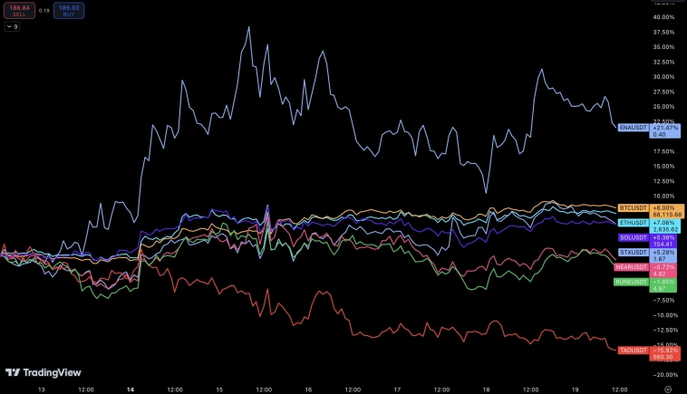 Перед тем как вы погрузитесь в изучение статьи, обратите внимание на тот факт что всё упомянутое в ней не является финансовой рекомендацией для принятие более взвешенного решения просьба провести свое собственное исследование. ________________________________________________________________________ В список Best Idea Long на эту неделю вошли следующие токены: $SOL, $RUNE, $TAO, $NEAR, $STX и $ENA. $HNT был удалён из списка просто из-за плохих результатов и высоких альтернативных издержек. Между ИИ и мемами, возможно, не существует достаточного количества внимания для того, чтобы DePIN смог достичь таких больших успехов, которые мы ищем в этом секторе на данный момент. $ENA $ENA ( +21,4%, 7D) снова возглавил наш список на этой неделе, поднявшись более чем на 21% за прошедшую неделю. Это еще одно подтверждение более широкого тренда, поскольку на прошлой неделе токен вырос на 10 %. Похоже, что для привлечения внимания к $ENA и повышения цены на него потребовались KOL. В данном случае 0xEN