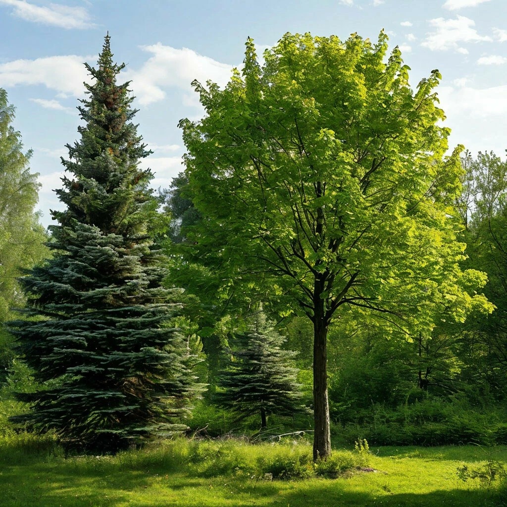 - Лиственные: дуб, берёза, тополь, клён, липа, осина, ива, рябина, яблоня, груша.