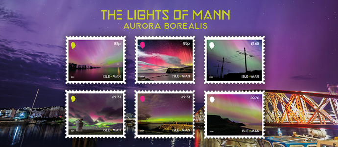 Почтовое ведомство острова Мэн 25 октября 2024 года выпускает этот набор из шести марок, выпущенных в сотрудничестве с Астрономическим обществом острова Мэн и организацией «Visit Isle of Man», на которых изображено северное сияние в небе острова Мэн. Максин Кэннон, генеральный директор Stamps & Coins, сказала: «Мы очень рады отметить естественную красоту северного сияния с помощью этого выпуска марок. Темное небо острова Мэн дает уникальную возможность стать свидетелем этого впечатляющего явления, и мы гордимся тем, что запечатлели это волшебство в этой коллекции. Это демонстрирует, что вам не нужно ехать в Северную Европу, чтобы стать свидетелем такой красоты, так много раз в 2024 году она была прямо у нашего порога. Она добавила: «Я хотела бы поблагодарить всех, кто работал над этим вопросом, и моя особая благодарность представителям общественности острова Мэн, которые откликнулись на нашу просьбу прислать свои изображения». Размер марок составил 40 мм x 32 мм. Марки выпускались в ли