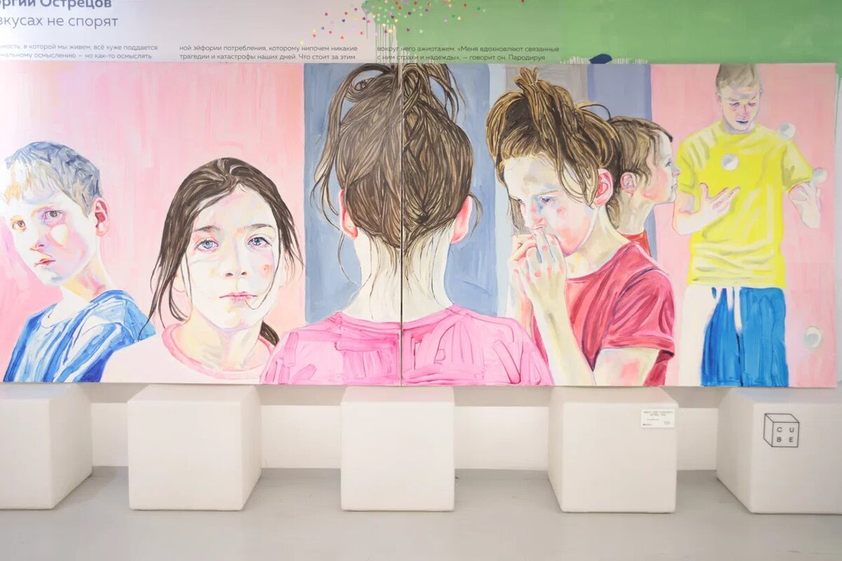При входе в арт-пространство Cube.Moscow гостей встречает длинное полотно в розовых цветах, мимо которого невозможно пройти мимо. Это работа художницы Кати Щегловой «Эффект пинг-понгового шарика». С картины на нас смотрят дети – светленький мальчик со взглядом в упор, рядом с ним – девочка со сжатыми губами, другая девочка стоит к нам затылком. Хочется ей сказать: «Повернись, можно я тебя обниму?».
