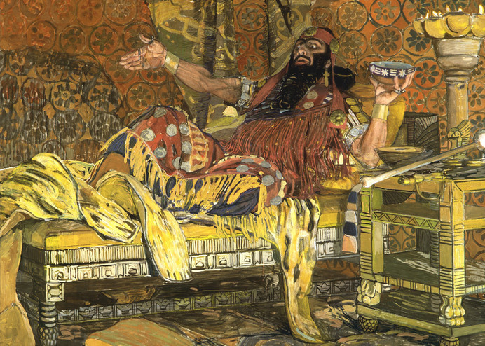 Трудно представить себе более театральный портрет. Конечно, крупнейший художник и декоратор Александр Головин, создал целую галерею артистов в сценических образах. Несколько раз он писал и Шаляпина — в ролях Мефистофеля, Демона, Фарлафа, Бориса Годунова. Но в этом портрете, где Федор Иванович изображен в костюме и гриме библейского царя Олоферна из оперы Серова «Юдифь», театральными страстями наполнено всё. Герой возлежит на роскошном ложе в пышно убранном шатре. В правой руке он держит чашу, ну а левую, в надменном жесте, простирает вперед. По сюжету упорное сопротивление жителей осажденного города вызывает у тирана ярость. Завтра же прикажет он начать штурм. И вот неожиданно Олоферну приносят весть, что в ассирийский стан пришла иудейка невиданной красоты и желает с ним встречи. Библейскую легенду на сцене Мариинского Шаляпин рассказывает с чувством, под стать музыке Серова — подчеркнуто патетичной, с балетным дивертисментом, сценической эффектностью и зрелищностью. Каков величавый ж