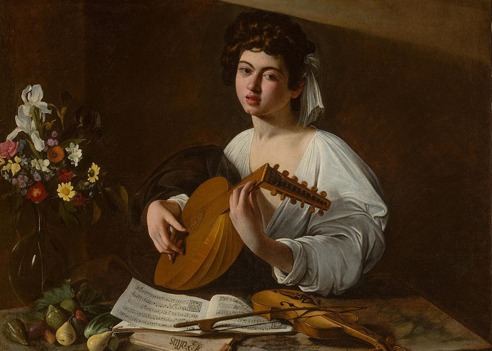 Молодой человек с мягкими девичьими чертами, одетый в свободную рубаху, широко раскрытую на груди, перебирает струны своей лютни. Наблюдая за его губами, можно подумать, что он напевает. Перед ним, на мраморном столе лежат раскрытая нотная тетрадь и скрипка со смычком. Свою картину «Юноша с лютней» Микеланджело Меризи да Караваджо выстраивает как жанровую сцену и, одновременно, как натюрморт. Помимо музыкальных инструментов тут есть еще фрукты, овощи, цветы в вазе. Груша хвостиком задевает нотную страницу, исполненную так четко, что можно, при желании, расшифровать мелодию — что и сделано было уже давно. Мелодия эта — мадригал фламандца Якоба Аркадельта, работавшего преимущественно в Италии и внедрившего в итальянскую музыкальную культуру многочисленные лирические пьесы. Композитор писал их на стихи Петрарки, Якопо Саннадзаро и других (в том числе анонимных) поэтов. Мадригал на картине называется Voi sapete ch’io v’amo — «Вы знаете, что я вас люблю». Полотно, изображающее лютниста, исп