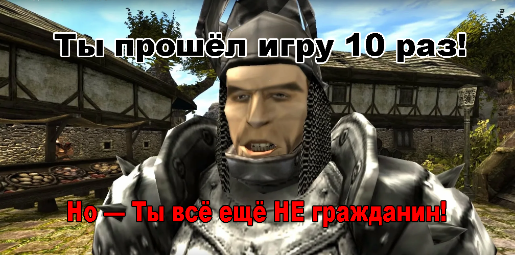 А с бумажкой — человек! Всю игру мы пробиваемся сквозь стену презрения. Сначала скребёмся в ворота Хориниса, смущая охрану грязным рубищем и пустотой кошелька, затем пролезаем в город, чтобы понять — главный герой даже хуже бомжа, которого никуда не пустят без статуса гражданина. Нас постоянно тыкают носом в социальный статус и финансовое положение. Даже точно такие же бомжи готовы нас ограбить (никакой солидарности).
