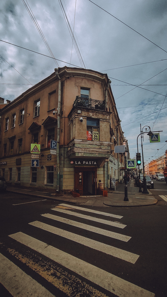 Небольшой особнячок на углу Владимирского проспекта и Графского переулка невелик, по сравнению с окружающими его постройками, но памятная доска на стене и мрачный эркер на углу второго этажа, заставляют обратить на это место внимание. Старинное здание 1839 года постройки, руки архитектора с пиратской, возможно, фамилией Морган, было построено для почт-директора Пряничникова. Федор Михайлович проживал в этом доме с 1842 по 1845 годы, на втором этаже, в трёхкомнатной квартире, с окнами выходящими на Графский переулок. И вот здесь, конечно же, начинаются споры, именно ли эту квартиру занимал великий русский писатель. Известно что автор любил квартиры с видами на церковь, и данная квартира подходит. Угол здания здесь с видом на Владимирский собор. Но, так же пишут что в этом здании квартира была с окнами на переулок, и это нам тоже подходит. Цитата - "...в квартире было три комнаты, средняя - приемная, и налево и направо две другие...". Думаю, это место вполне может быть квартирой Достое