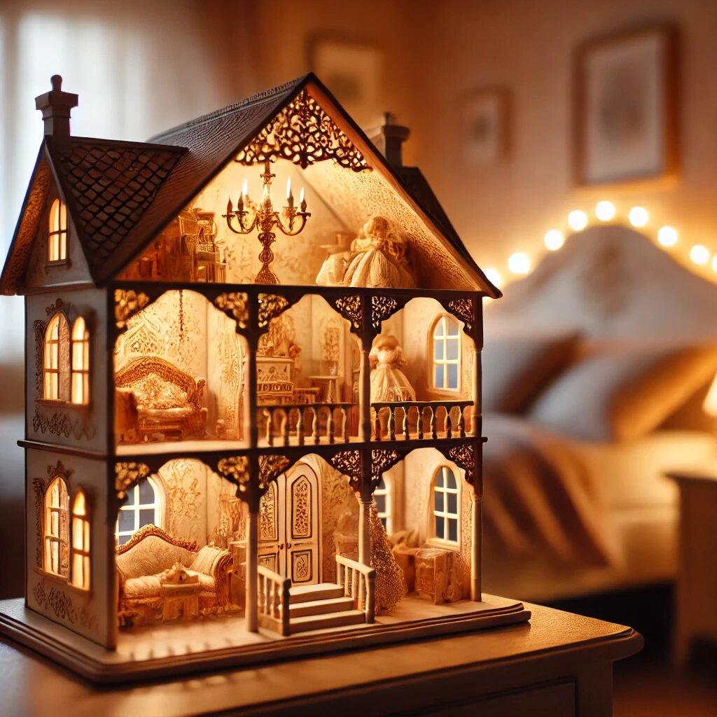 Маша не могла отвести взгляд от подарка, который бабушка вручила ей на день рождения. Это был настоящий шедевр — роскошный кукольный домик, украшенный золотыми узорами, с изысканными мебелью и миниатюрными люстрами. Всё было таким детализированным, что казалось, будто этот дом принадлежит не куклам, а настоящим людям.