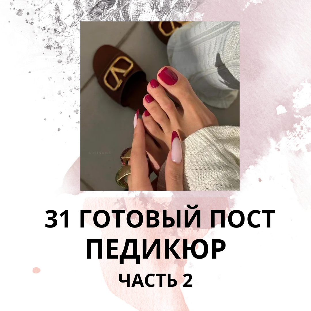 В поисках готовых постов для своих социальных сетей? Мы подготовили для Вас 31 Готовый пост, который Вы сможете использовать в своих социальных сетях для привлечения новых клиентов. Купить посты на тему "Педикюр" можете на ВБ: Темы постов: 1.Как выбрать идеальный лак для педикюра в зависимости от сезона? 2.Педикюр и здоровье ногтей: как процедуры влияют на их состояние? 3.Как правильно ухаживать за ногами между процедурами педикюра? 4.Преимущества регулярного педикюра для здоровья ног 5.Педикюр для мужчин: что важно знать? 6.Как выбрать качественные средства для домашнего ухода за ногами? 7.Как предотвратить вросшие ногти и мозоли? 8.Что делать, если появились трещины на пятках: советы мастера 9.Как педикюр помогает при проблемах с потливостью ног? 10.Как выбрать идеальный педикюр для осеннего сезона? 11.Почему стоит доверять педикюр профессионалу? 12.Как педикюр может улучшить состояние кожи ног при диабете? 13.Секреты идеального педикюра: как продлить стойкость покрытия? 14.Советы по