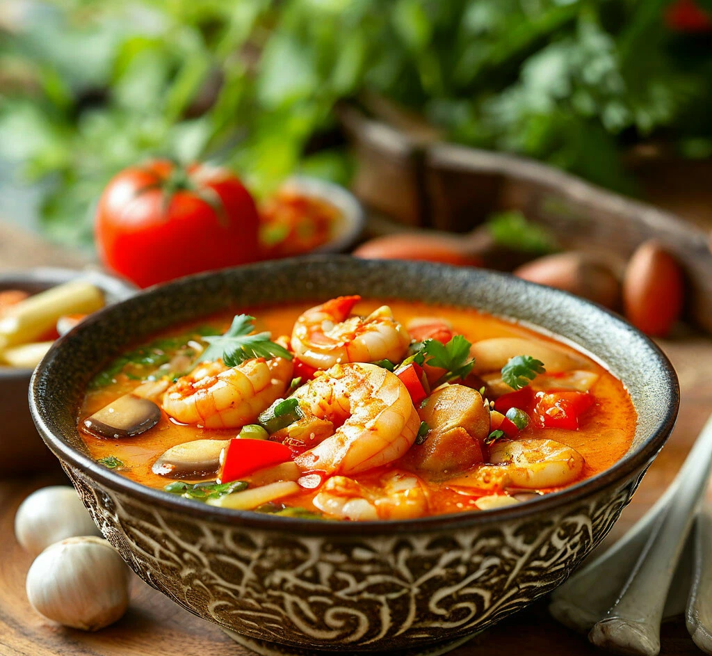 Том Ям с креветками, помидорами и грибами, используя доступные российские ингредиенты. Этот ароматный суп идеально подходит для любителей острых блюд! Этот Том Ям с креветками, помидорами и грибами — отличный способ насладиться ярким вкусом тайской кухни, даже с использованием доступных российских ингредиентов. Приятного аппетита!