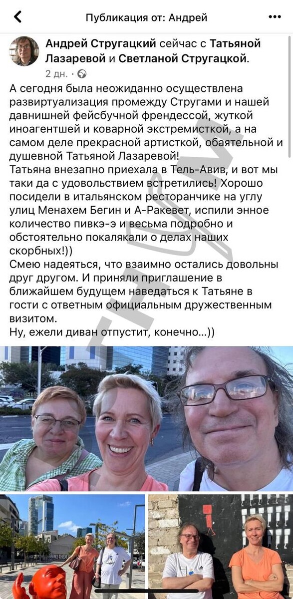 Объявленная в розыск в России террористка и иноагент Татьяна Лазарева похвасталась со страниц своих соцсетей фотографиями "новых идеологических друзей". "Танюська-симпапуська" в солнечном Тель - Авиве встретилась с Андреем Стругацким и его супругой Светланой.