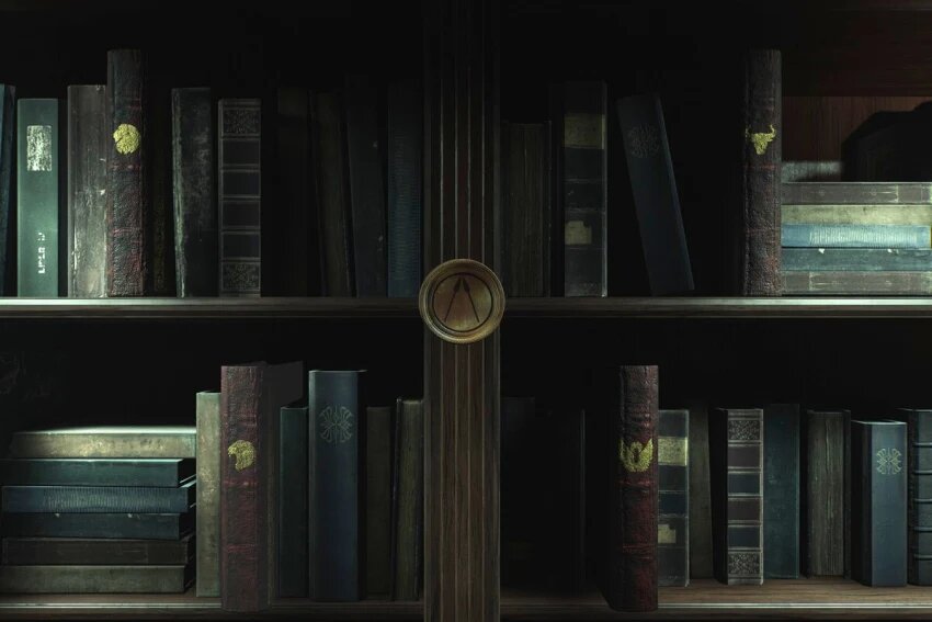 Эта головоломка, вероятно, одна из самых простых во всей игре, ведь ответ прямо перед нами на огромной картине в той же комнате. Однако, как и во многих других аспектах игры, если не обратить внимание на детали и не исследовать каждый уголок, можно пропустить множество важных подсказок. В читальном зале мы найдем разные книги, которые нужно расставить на полке. Каждая книга украшена изображением животного, соответствующим картине на корешке. В комнате находятся все необходимые нам книги, так что решить эту головоломку не составит труда. Важно заметить, что копья на картине пронзают человека вниз, в то время как копья на эмблеме на полке стоят вертикально. Это означает, что изображение необходимо перевернуть.