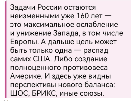 Цитата, Д.Медведев, окт. 2024 г.: Про ослабление понятно, не единожды от гаранта стабильности слышано. Но унижать... фу, как-то не интеллигентно и не умно. Поэтому они усиленно делают образ России неинтеллигентным. С дурака какой спрос? Замахнемся и унизим. Крушить Америку будем по-путински: построим совместно с БРИКС новую финансовую систему, "чтобы навести удар по доминированию Америки и защитить Россию и ее друзей от санкций". Тут типа, вначале нагородили себе препятствий, потом мужественно их преодолеваем и радуемся. Я не умею мыслить масштабно как Дугин. Поэтому никак не могу понять своими кухонными мозгами, как, сокрушив и унизив Америку с Европой, сплотив вокруг себя друзей, априори слабее нас, у нас получится многополярный