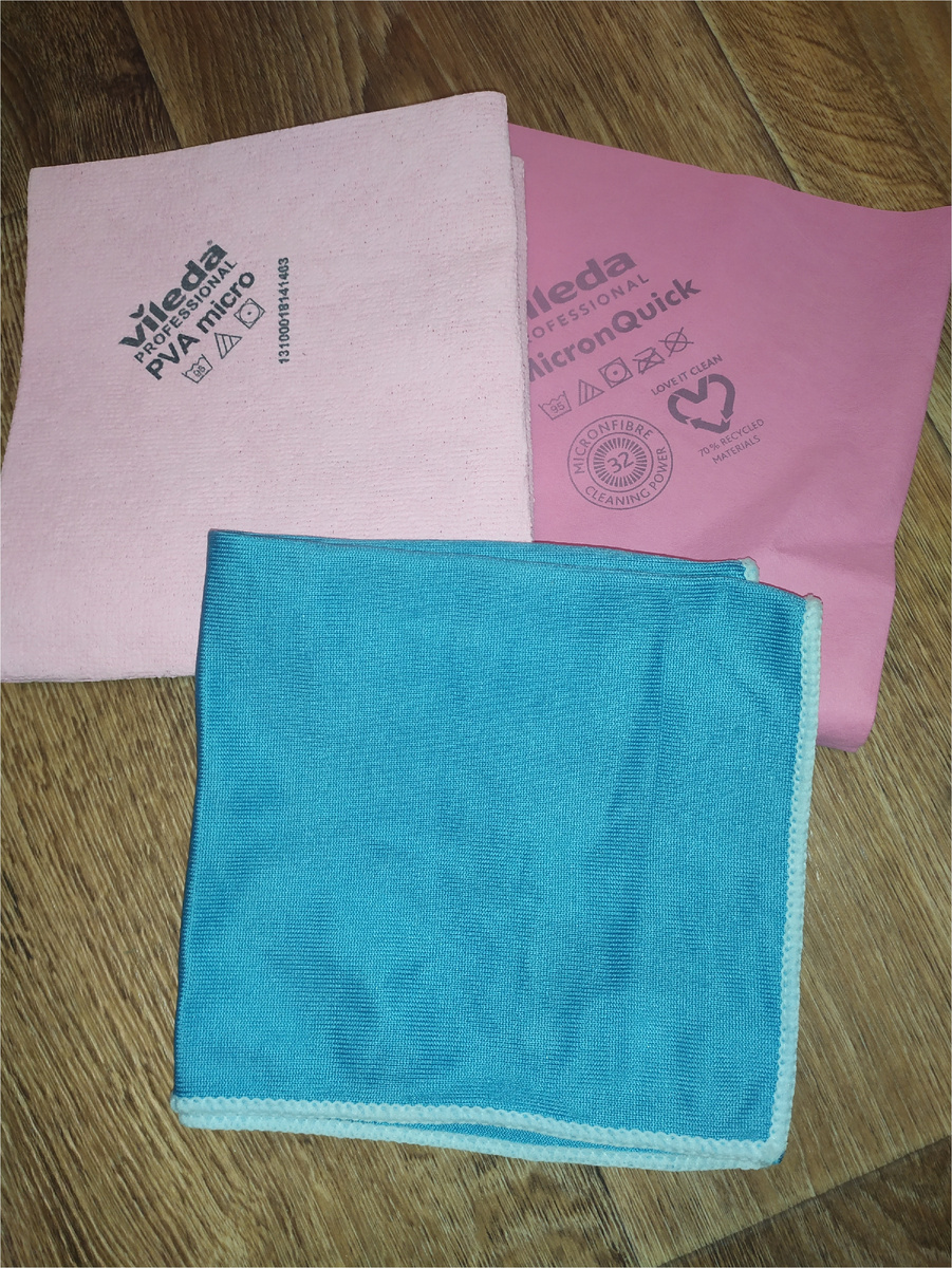 У кого в доме или квартире много зеркал и стеклянных поверхностей, наверняка, замучились с отпечатками, которые оставляете вы и детки постоянно. Хотелось бы показать виды тряпок для уборки, которые являются экологичными и один шаг 2 Vileda профессиональные и синяя куплена в Офисмаг. 1. PVA micro тряпочка не плохая, при намокании похожа на мягкую резину, весьма не плохо убирает следы воды и отпечатков пальцев, но при неправильном уходе быстро выходит из строя и рвётся. 1 шт стоит примерно 250, в основном продают по 5 шт. 2. Синяя из Офисмаг. Обычная тряпочка, её можно сушить на полотенцесушителе, убирает следы воды и отпечатков, но оставляет после себя матовый след. Стоит до 70 руб. 3. Это тряпочка одна из моих фаворитов. Покупала я её в масс-маркете упаковкой. Она профессиональная MicronQuick. Похожа на замшу, идеально чистит зеркала, окна и многие блестящие поверхности, сантехнику. Такую тряпку нельзя стирать порошком и сушить на батарее, желательно просушить на ведре. Испо