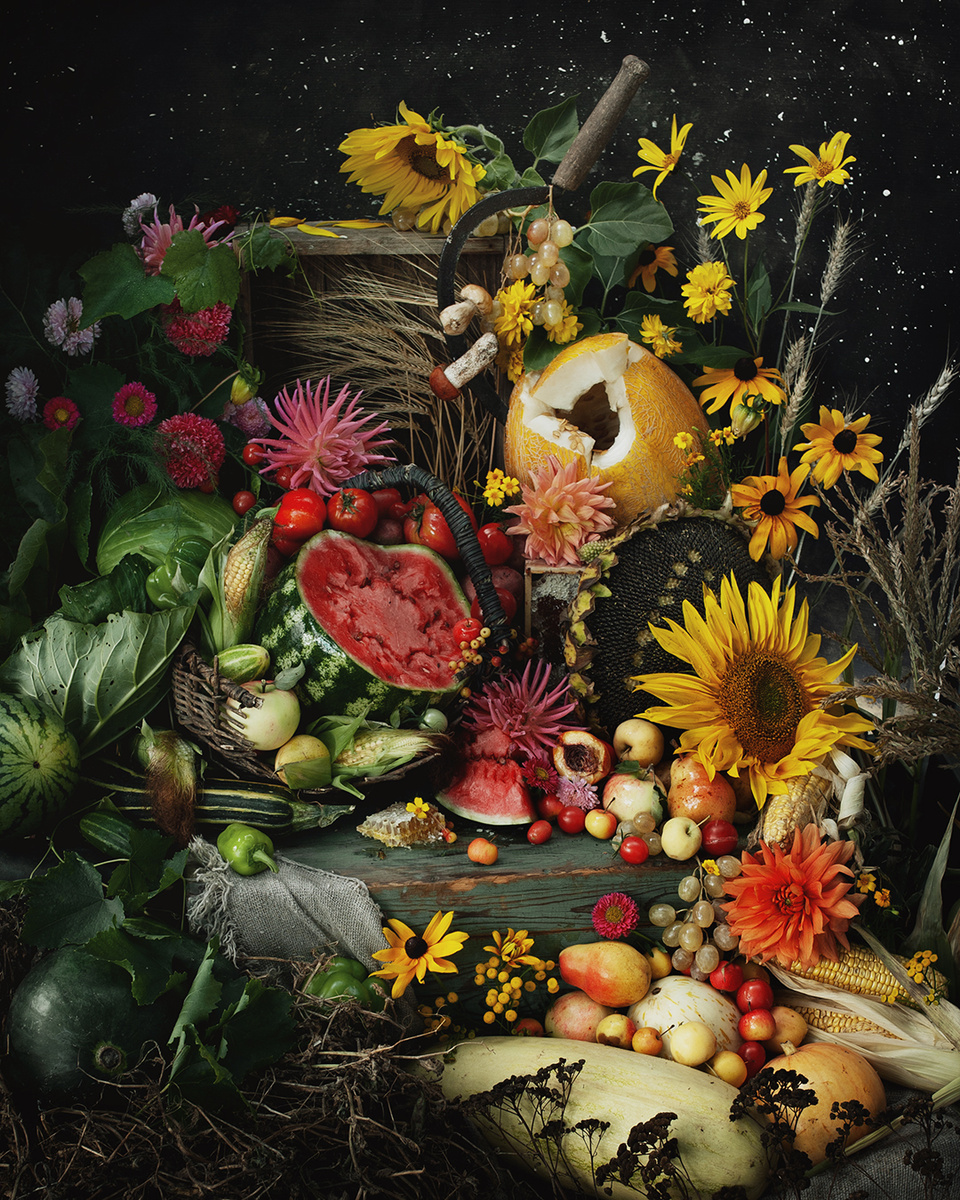 Последний месяц лета, наполненный плодами и спелыми дарами. Жара и краски лета постепенно начинают меркнуть в преддверии осени. Ночи, освещенные яркими звездами, становятся холоднее. Для августа у меня не было сомнений в выборе реквизита. Конечно здесь должно быть как можно больше урожая, которым нас щедро одарило лето. Постаралась собрать здесь буквально всё, что смогла разыскать. В первую очередь это классические августовские кушанья: арбуз, яблоки и мёд. Не забыла добавить колосья пшеницы и ржи, чтобы показать урожай не только в садах и огородах, но и в полях. Так же добавила грибы, чтобы напомнить, что и в лесах начинается урожайный сезон. В композицию отлично вписались сезонные цветы подсолнечника, астры, георгины и топинамбур. Здесь как и в июле месяце я постаралась заполнить всё пространство кадра, чтобы показать богатство и насыщенность этого периода. Сделала символическую растяжку из зеленого, красного и желтого цветов, чтобы показать как летняя зелень сгорает(красный) и превр