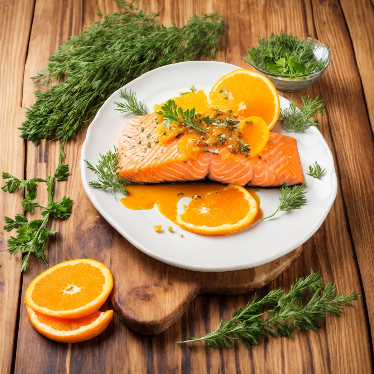 Ингредиенты: - Филе лосося — 500 г - Апельсин — 1 шт. - Мед — 2 ст. л. - Соевый соус — 2 ст. л. - Оливковое масло — 1 ст. л. - Чеснок — 2 зубчика - Имбирь — 1 ч. л. (тертый) - Соль и перец — по вкусу Рецепт: 1. В миске смешайте сок апельсина, мед, соевый соус, оливковое масло, тертый имбирь и измельченный чеснок. 2. Филе лосося посолите и поперчите, затем залейте маринадом. Оставьте на 20-30 минут. 3. Разогрейте сковороду и обжарьте лосося с каждой стороны по 3-4 минуты до золотистой корочки. 4. Подавайте с ломтиками апельсина и зеленью.
