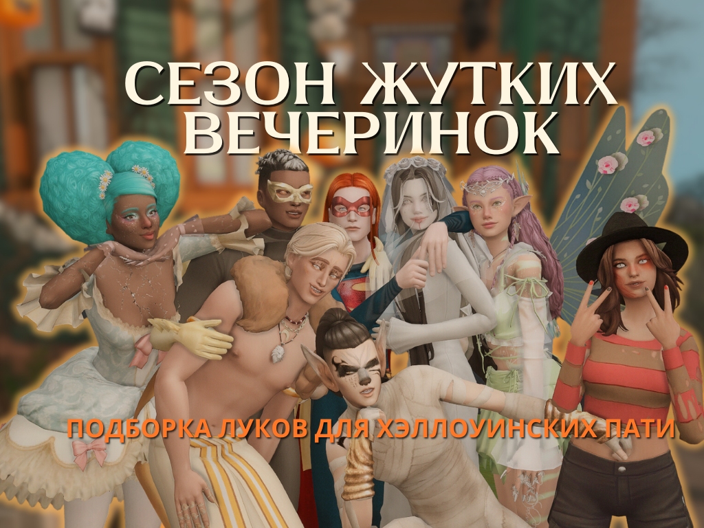 Сайт проекта Телеграм-канал До хэллоуинских вечеринок осталось всего несколько дней. Самое время подобрать наряды нашим человечкам! Собрали для вас яркие образы, в которых симы точно не останутся без внимания. Ниже вас ждут костюмы для взрослых, детей и тоддлеров со всеми ссылочками. Одежда: Аутфит Перчатки Грим, прическа: Тени Подводка Глиттер на щеках Грим на теле Прическа Одежда: Свитер + реколор Шорты – базовая игра Чулки Ботинки Грим, прическа: Подводка Тени Помада Грим на глазах Шрам на щеке Прическа Шляпа Одежда: Топ + юбка Босоножки Крылья Кольца Серьги Грим, прическа: Подводка Глиттер Помада Линзы Прическа Ожерелье Диадема Уши Тату Второе тату на все тело Одежда: Платье Ожерелье Грим, прическа: Подводка Тени Черные слезы Помада Кровь на губах Грим на все тело Прическа Оверлей белые пряди на волосах Вуаль Вуаль с розами Одежда: Костюм мумии Браслеты Грим, прическа: Грим на глазах Маска Тату Прическа Одежда: Суперкостюм Обувь Грим, прическа: Линзы + тени Маска Прическа + овер