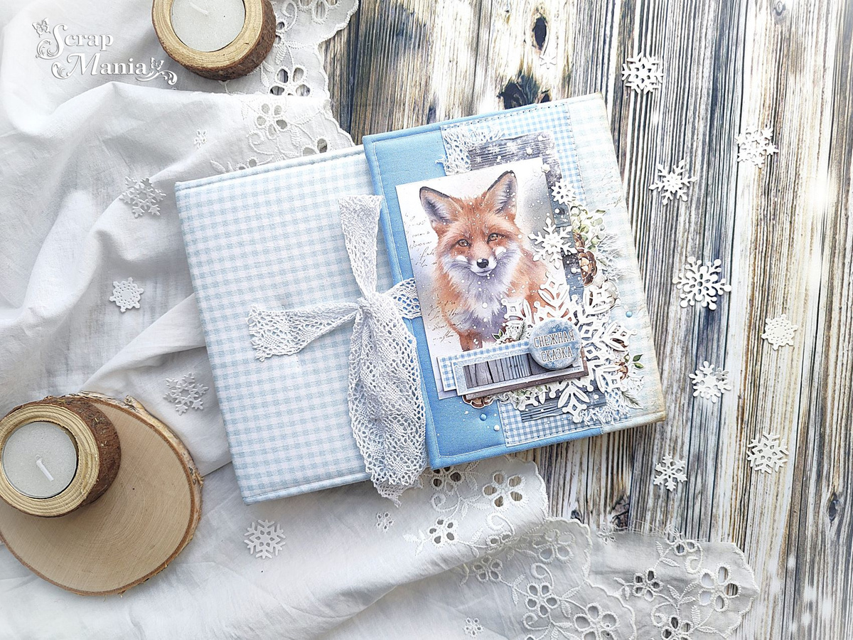 Всем привет, дорогие друзья! Сегодня с вами Надежда Горбач, и я хочу вдохновить вас своей новой работой, выполненной из коллекции "Снежные сказки". Какая же это классная коллекция! А какие там животные! Просто восторг! Не смотря на холодную гамму, коллекция очень теплая и приятная в работе. Все оттенки коллекции очень гармоничны и идеально сочетаются. Ее размер 21х16,5 см, корешок 2 см, закрывается с помощью завязочек из хлопкового кружева. Обложка выполнена из переплетного картона, толщиной 1, 5 мм. Обложка составная, обтянута тканью в клеточку и небольшим отрезом другой ткани голубого цвета. Именно на этой части я и разместила всю композицию с декором. Солирует здесь, конечно же карточка с лисой (лист 10х30), а вот уже вокруг нее я и располагала всю композицию. Пустила в дело обрезки бумаги, вырезалки (лист 10х30, из наборов 20х20 и 30х30, вырубку (ножи "Снежинка большая 4", "Снежинки 2. Пушистые"), добавила фишку, вырезалки из набора 30х30, брадсы, немного полубусин, набрызг и вот о