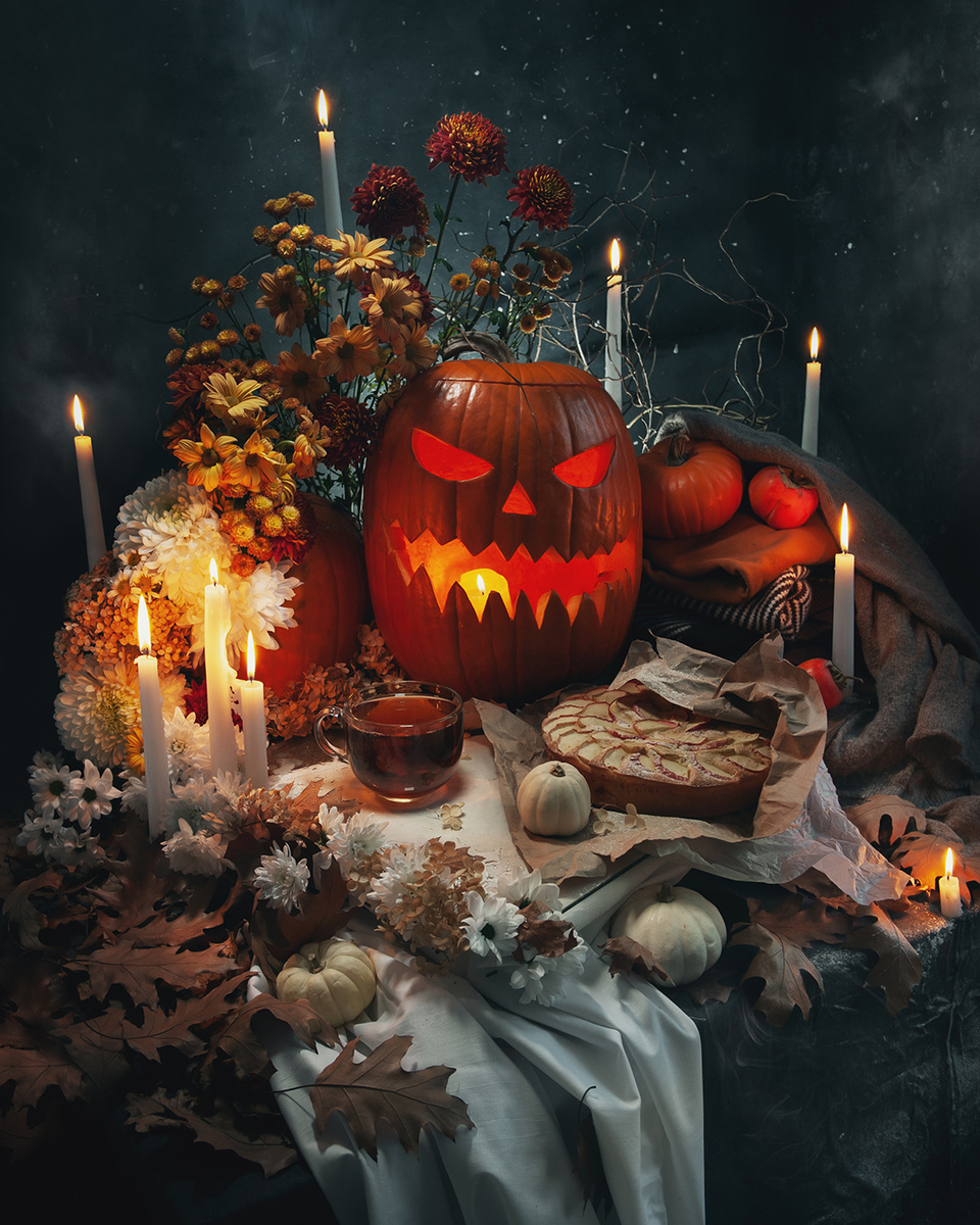Середина осени. Переходное время. Яркие краски сменяются тусклой палитрой. Наступают холода, опадают листья и выпадает первый снег. Вечером на улице уже непривычно темно. И мы спешим к очагу, в тепло. Поскорее закутаться в одеяло и выпить горячего чаю. Для воплощения октября я собрала реквизит, который ассоциируется с этим месяцем. Это кружка чая, шарлотка(однозначно это время пирогов из недавно собранного урожая), опавшие потускневшие листья, последние цветы(хризантемы и уже высохшие гортензии), свечи, голые ветки деревьев, стопка теплых свитеров, тыквы на любой вкус. Композицию я постаралась собрать в символической форме костра. Центральная часть которой это домашний уют и тепло с горячим чаем и свежеиспеченным пирогом. Свечи очерчивают границы очага уюта, защищая нас от непроглядной мглы вокруг. Осенние хризантемы как последний лучик жизни вырываются вверх. А сзади уже голые ветки отбрасывают причудливые тени. Сухие листья лежат в нижней части кадра, как и опавшая листва в это время