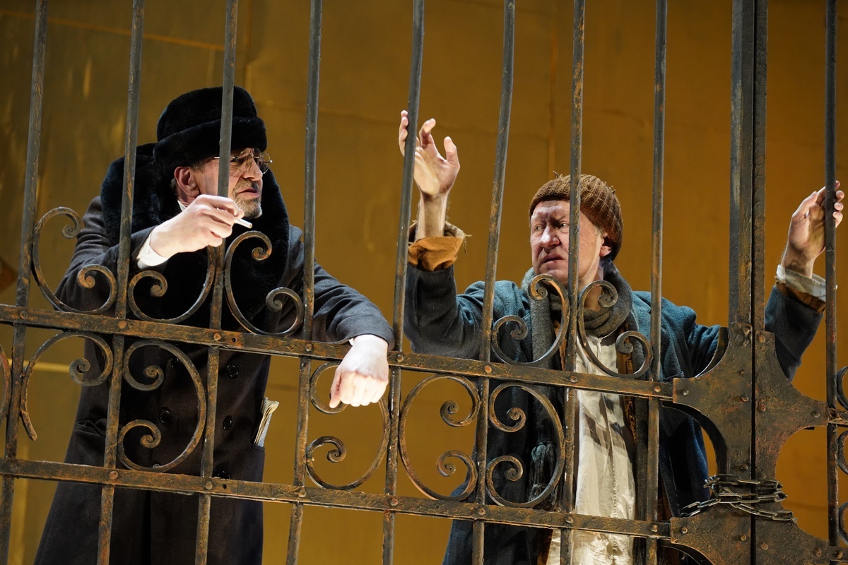 Пространство сцены зажато между задником декорации и высокой кованой решеткой, отгораживающей от зрителя двор психиатрической лечебницы, хаотично заставленный чугунными ваннами. Цыплячье желтые, местами с растрескавшейся штукатуркой, стены скорбного дома и непарадное крыльцо, из которого пациенты выходят на прогулку, выдают в облике изображенного заведения реальную психиатрическую больницу Николая Чудотворца, в простонародии «Пряжку», построенную на Мойке как тюремно-исправительное заведение «для лиц предерзостных, нарушающих благонравие и наносящих стыд и позор обществу». Сюда помещали женщин за «развратную жизнь, неповиновение родительской власти и самовольную отлучку из дома», а мужчин за «неплатёж налогов и упорное пьянство». Впоследствии Пряжка стала известным заведением карательной психиатрии, в которую принимали как людей с реальными душевными недугами, так и политических узников. Доказательств тому, что Чехов писал свое произведение именно про нее, нет, но Лев Додин, прекрасно знающий историю, помещает своих героев именно сюда, в место, где лежали Хармс, Бродский, Цой, жена Чайковского, писатель Гаршин и многие другие. Прильнув к решетке во время краткой прогулки душевнобольные по очереди излагают свои несвязные мысли, и ладно, если по-русски, а то на немецком или вообще языке жестов. Лишь Иван Дмитриевич Громов (Игорь Черневич), впечатлительный и грустный мужчина средних лет, рассказывает о себе внятно и с расстановкой. Он вспоминает прежние времена, и как когда-то, встречая на улице арестантов, он все сильнее чувствовал, что «насилие всего мира скопилось за его спиной и гонится за ним», и его самого в любой момент могут «заковать в кандалы» и отвести в тюрьму. Потерявшего доверие к людям, поглощенного депрессией и паранойей, его поместили в палату №6 как неизлечимого больного. Здесь динственным собеседником Громова становится доктор Рагин (Сергей Курышев), когда-то усердный врач, а после разочарованный, выгоревший, хотя не старый еще человек, приобретший вместе с жизненным опытом циничное отношение к людям и к жизни в целом. Он единственный, кто приходит в зарешеченный двор со стороны «воли» – проходя мимо первого ряда зрительного зала. Дворник Никита (Павел Грязнов) запирает за ним калитку. Но после этого уже не покинет пространство тюрьмы-больницы, будто оказавшись ее заложником вместе со своими пациентами. Сперва, конечно, в тепле да с пивом, но и это не надолго.