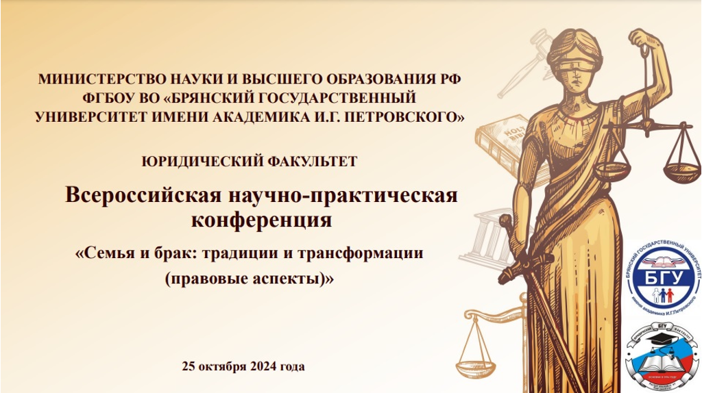 25 октября при поддержке ректората в Брянском госуниверситете состоялась Всероссийская научно-практическая конференция «Семья и брак: традиции и трансформации (правовые аспекты)». Участниками мероприятия стали судьи Брянского областного суда и Арбитражного суда Брянской области, работники Прокуратуры Брянской области, адвокаты, должностные лица, сотрудники государственных органов, практикующие юристы, представители научного сообщества.