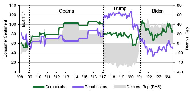 Выборы в США состоятся всего через неделю, и их результат приведёт к значительным изменениям в портфелях инвесторов и поведении потребителей. Не верите мне? Тогда вы не обратили внимания на многочисленные исследовательские работы, которые документируют растущий партийный раскол в США не только в политических, но и в финансовых вопросах. Элизабет Кемпф и Маргарита Цоутсура обобщили основные выводы этих исследований в краткой обзорной статье. Хотя политическая поляризация растёт в Великобритании и Европе, она далеко не так экстремальна, как в США, и я не знаю ни одного исследования, которое бы показывало значимое влияние политических взглядов на поведение инвесторов. Тем не менее, в США вы можете увидеть партийный раскол в самых разных местах. Опросы потребительских настроений к настоящему времени настолько запятнаны политическими взглядами, что стали бессмысленными. Если президентом становится республиканец, республиканцы думают, что экономика работает отлично, а демократы думают, что о