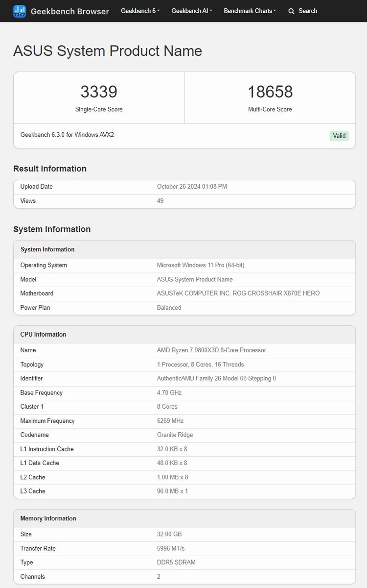 До релиза процессоров AMD Ryzen 7 9800X3D остается меньше двух недель, а потому никого не удивляет появление в сети результатов тестирования грядущей новинки. Так сегодня перед нами тесты процессора в Geekbench, которые показывают, что в однопотоке он не отстает от R9 9950X, а в многопотоке вплотную приблизился к i7-14700K от Intel (разница всего 400 баллов в пользу "синего"). При этом 9800X3D это 8-ядерный процессор, а i7-14700K — 20-ядерный. В это же время 9800X3D оказался на 25% быстрее своего предшественника в лице R7 7800X3D. Дополнительно стоит отметить, что 9800X3D, судя по всему, будет без проблем превышать свои паспортные частоты буста в 5,2 ГГц за счет PBO и, скорее всего, ручного разгона. TDP процессора идентично его предшественнику и составляет 120 Вт.