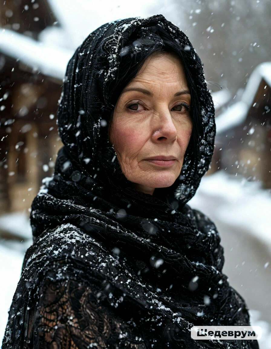 Аленка подошла к ведьме, с изумлением посмотрела в ее лицо. Оно было молодым и почти неузнаваемым, по упругим смуглым щекам текла вода от тающего снега, хлопья цеплялись за ресницы, и повисали на них, как кусочки ваты на елочных иголках,но тоже таяли, превращаясь в слезинки. Волос было не видно под темным блестящим платком, а вот брови - тонкие, разлетающиеся к нежным впадинкам висков были черными, как нарисованными.