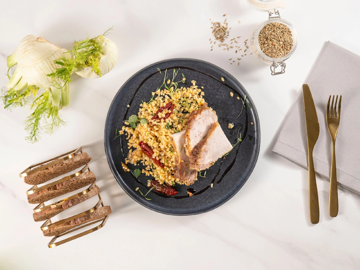 Продолжаем рассказывать о нашей линейке мяса для запекания, и сегодня в центре внимания — карбонад. Это самая нежная часть свинины с минимальным количеством жира. Мы заранее замариновали мясо в итальянских травах и пряностях, чтобы максимально упростить процесс приготовления. Вам нужно только снять наклейку с пакета, надрезать его сверху и поставить в разогретую духовку. Жаропрочная упаковка позволит не использовать форму для запекания Через 90 минут мягкое, сочное, ароматное мясо будет у вас на столе! Запеченный карбонад можно нарезать утром на бутерброды, использовать в качестве закуски на большом семейном обеде. А можно сделать ломтики потолще и подавать как горячее с гарниром. У нас – булгур с вялеными томатами. Отлично подойдет также киноа со сладким перцем, красным луком и зеленью. Ещё одно отличное сочетание — это карбонад и овощи гриль или даже белокочанная капуста, особенно если сделать из нее стейки. Возьмите кочан капусты, нарежьте его ломтиками толщиной около 2 см. Разогрей