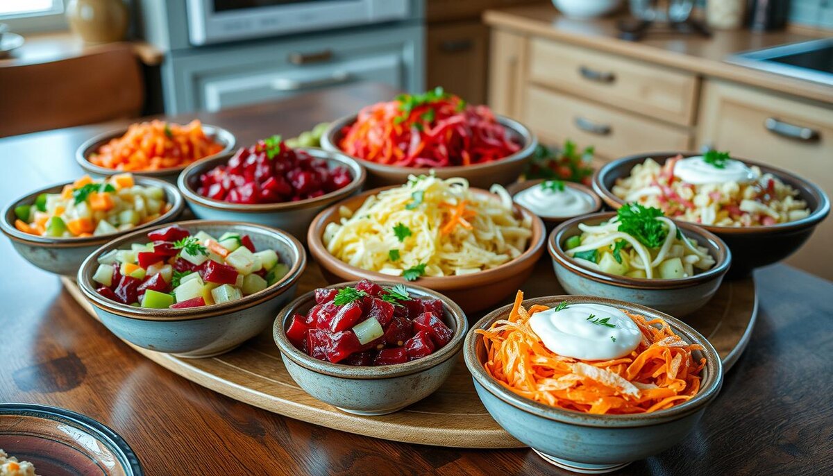 Современные российские салаты богаты разнообразием ингредиентов. В них используются овощи, фрукты, орехи и морепродукты. Техники приготовления тоже разнообразны.