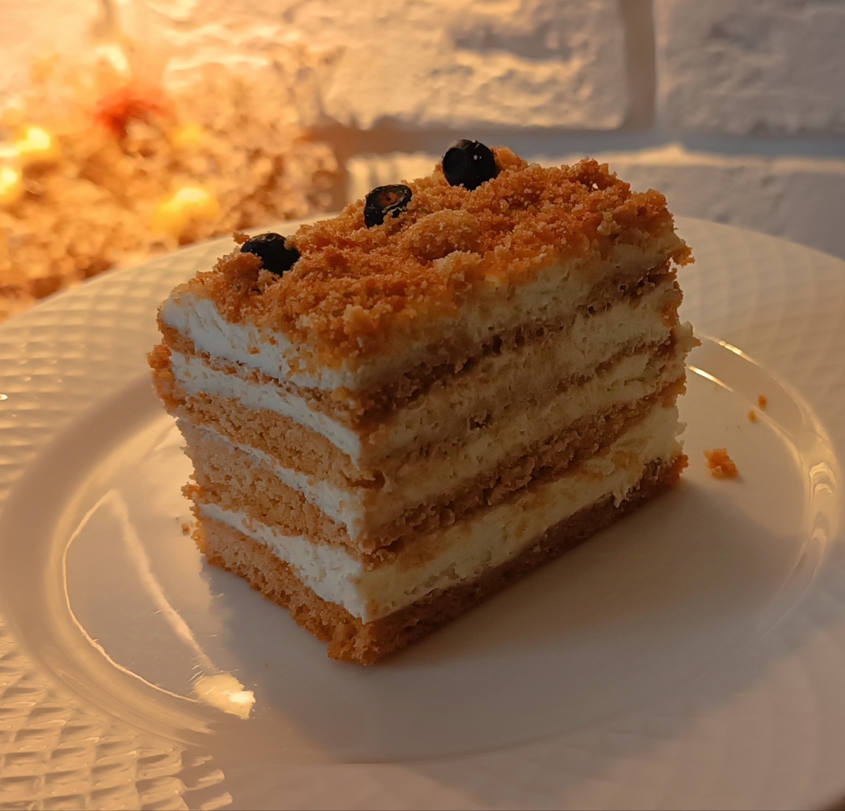 Торт из серии на скорую руку, готовится очень просто и занимает минимум вашего времени. А получается очень мягким, нежным, в меру сладким и безумно вкусным. Отправляем в кастрюлю мед, сахар и сливочное масло. На среднем огне доводим до кипения и растворения всех ингредиентов и выключаем огонь. Добавляем соду и интенсивно перемешиваем. Масса увеличится в объеме и станет воздушной. Оставляем минут на 5 немного остыть. Вводим яйца по одному, тщательно перемешивая. Постепенно добавляем муку и с помощью лопатки замешиваем тягучее, не слишком густое тесто. Делим тесто на 2 части и на противнях, застеленных силиконизированным пергаментом, размазываем два одинаковых коржа. Выпекаем коржи по одному, в разогретой до 180° духовке, по 7 минут на каждый корж. Даем остыть. Тем временем готовим крем. Просто отправляем в миску сразу все составляющие и взбиваем миксером до консистенции, которая позволит крему не стекать с коржей. Остывшие коржи кладем друг на друга и обрезаем края, они пойдут на по