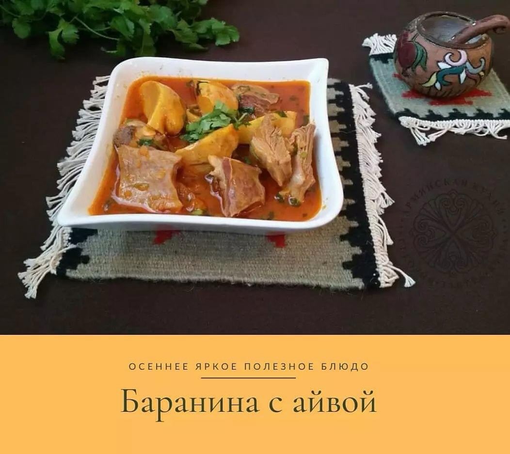 Модное сегодня сочетание сладкого и соленого всегда было популярно в армянской кухне. Мясо (птицу,рыбу) готовили и подавали с разными фруктами и сухофруктами: айвой, яблоками, черносливом, изюмом, гранатом, каштанами. Благодаря этому блюда приобретали изысканный и насыщенный вкус. Одно из самых любимых сочетаний - мясо с айвой. Особенно ароматно получается баранина. Попробуйте и не пожалеете. Если нет баранины, можно взять говядину. Для приготовления баранины с айвой нам понадобится: ✔️ 600 гр. баранины ✔️ 100 гр. лука ✔️ 100 гр.топленого(сливочного) масла ✔️ 500 гр. айвы ✔️ 50-60 гр. томатной пасты ✔️ соль и перец по вкусу ✔️ зелень (петрушка или кинза). Порубить мясо на порционные куски (я предпочитаю небольшие кусочки), промыть, залить холодной водой и поставить на сильный огонь. Снять накипь, довести до кипения и убавить огонь. Варить мясо на среднем огне до полуготовности. Достать мясо и процедить бульон. В толстостенной кастрюле растопить масло, в разогретое масло добавить мясо