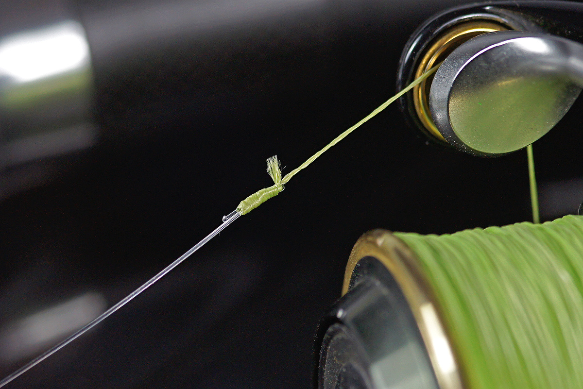 От узла, соединяющего мононить с плетеной леской, я ожидаю двух вещей: с одной стороны, он, конечно же, должен обладать высокой несущей способностью, а с другой стороны, он должен плавно скользить сквозь кольца при забрасывании. Узел Олбрайта прекрасно сочетает в себе оба свойства. Также идеально подходит флюорокарбон, который я люблю использовать при ловле окуня и судака. Когда я ловлю карпа на большом расстоянии, я часто использую тонкий узел – для соединения меловой лески и плетеной основной. Но я не хочу скрывать один небольшой недостаток: узел Олбрайта завязывать немного неудобно – с замерзшими пальцами неинтересно. При ловле судака на резиновую рыбку я предпочитаю использовать более длинный поводок из флюорокарбона в качестве защиты от острых камней и ракушек. Тонкий узел Олбрайта идеально подходит для соединения с тонкой плетеной основной леской! Сначала вдеваем плетёный шнур в петлю из мононити (белого цвета). Затем продеваем шнур (красный) и начинаем обматывать ее вокруг петли