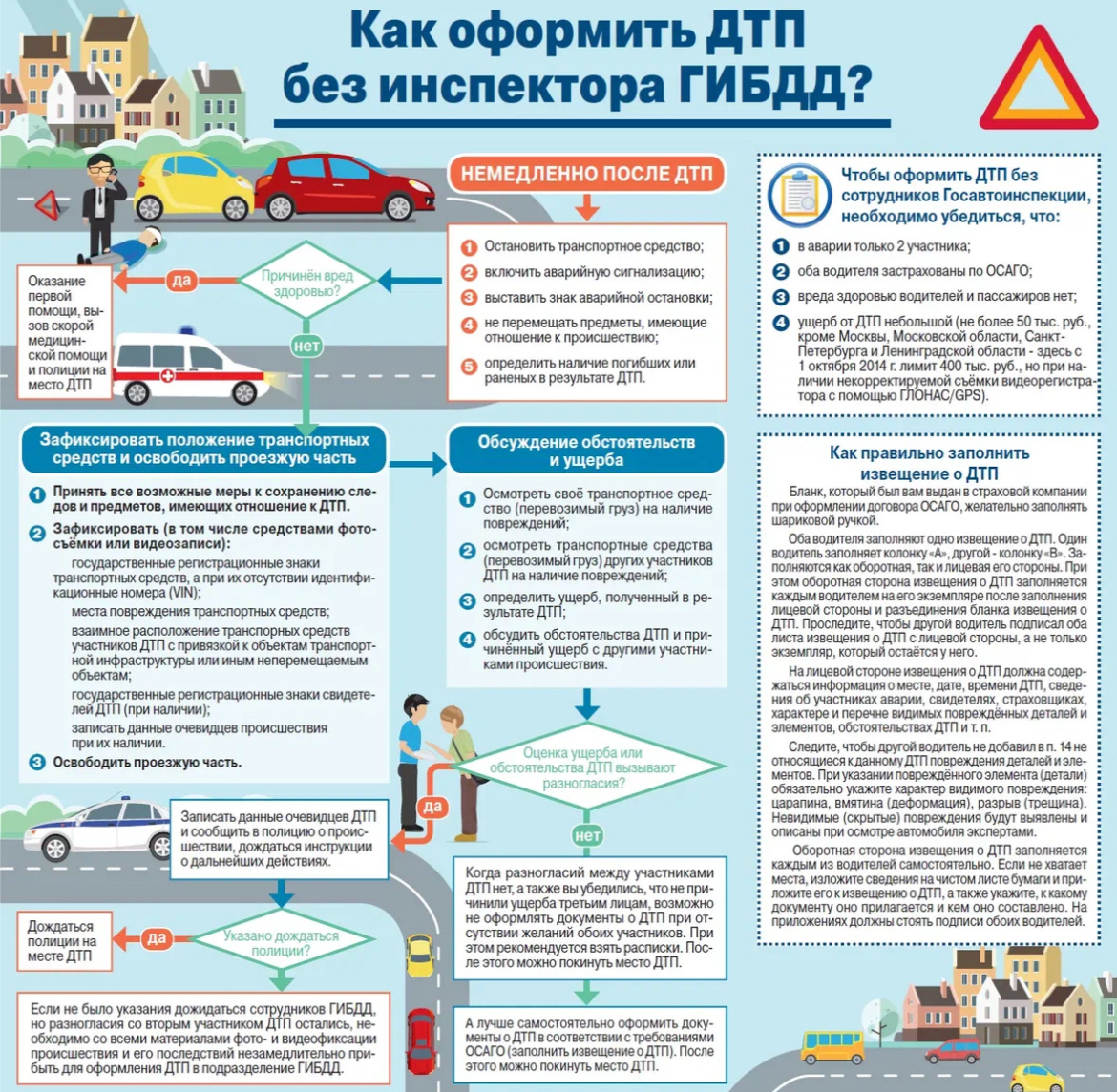 Оформить ДТП без инспектора ДПС можно по европротоколу. Для этого необходимо, чтобы были соблюдены следующие условия: Оформить европротокол можно двумя способами: Позднее извещение о ДТП нужно будет отдать в свою страховую компанию в течение пяти дней. Если в ДТП попало больше двух машин, у кого-то из собственников нет полиса автогражданки или на ремонт потребуется больше денег, нужно вызвать полицию.