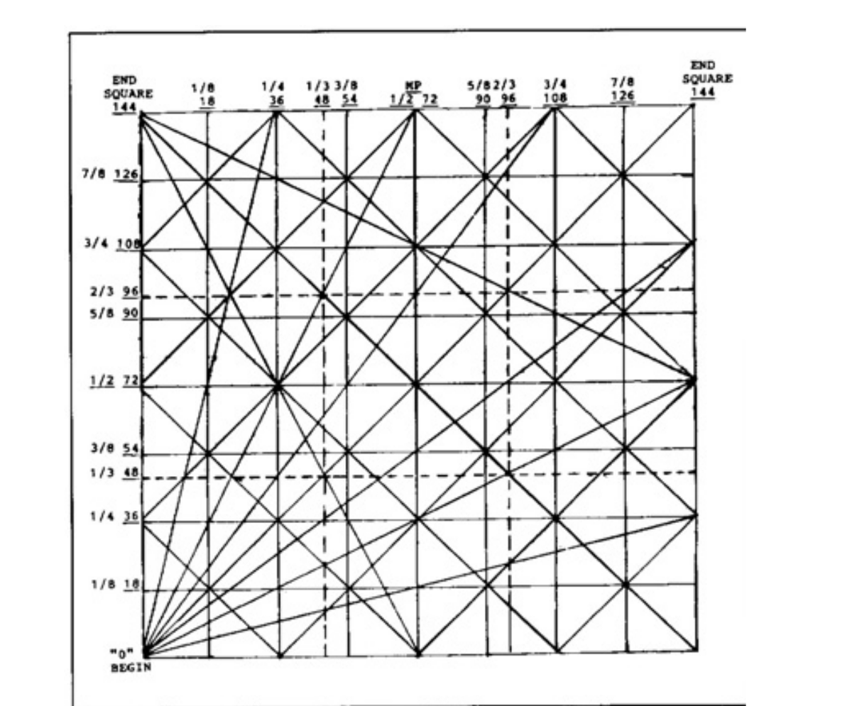 **Обзор схемы МАСТЕР КАЛЬКУЛЯТОРА ЦЕНЫ И ВРЕМЕНИ** показывает, что горизонтальная ось обозначает ВРЕМЯ, а вертикальная ось — ЦЕНУ. «Квадрат» (на самом деле прямоугольник) разделен на восьмые и трети в обоих измерениях. На основе многолетних наблюдений Ганн пришел к выводу, что когда цены достигают КОНЦА квадрата по времени (цена и время равны), происходит не только смена тренда, но часто эта смена сопровождается сильным импульсом в новом (и противоположном) направлении. Он также наблюдал смену тренда на 1/2 по цене и времени от середины, что он называл «Главным центром» квадрата. Ганн ранжировал деления цены и времени по важности следующим образом: