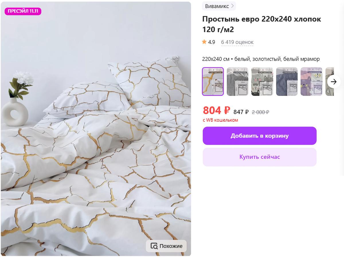 Выбор постельного белья для нас очень сложная и, можно сказать, больная тема, потому что мы, во-первых, не знаем, какой размер нам нужен, во-вторых, не разбираемся в тканях, а в-третьих, не пользуемся одеялом, поэтому комплекты с пододеяльниками нам не очень подходят. Очень удобно, что на Wildberries можно собрать набор из нужных тебе частей комплекта. В карточке каждого товара есть артикулы других товаров из комплекта, собрать можно в разных комплектациях и размерах. Сначала мы попробовали взять простынь, бязь оказалась не очень жесткой (по сравнению с другими комплектами из бязи, естественно, по сравнению с поплином любая бязь будет жесткой), но, главное для меня, что она не покрылась катышками после первых стирок, был у нас, увы, такой опыт. Поэтому через пару месяцев мы взяли еще и наволочки. Расцветка интересная, эффект золотых линий в реальности тоже присутствует, ткань не линяет и, как я уже сказала, не закатывается, по крайней после 2 месяцев, так что комплектом я очень довольна. Простынь, кстати, брала за 550 р, сейчас она заметно подорожала, но, думаю, это временно.